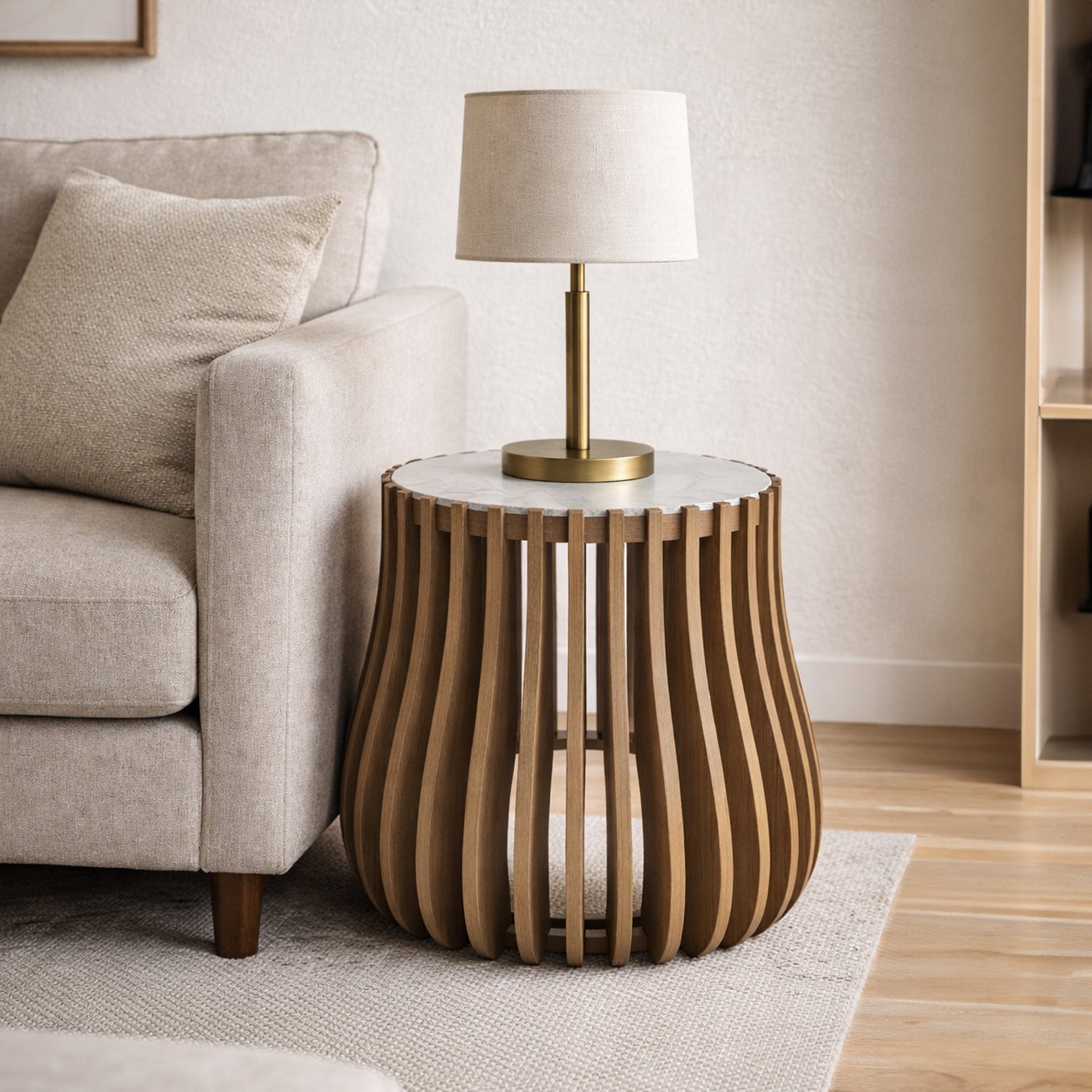 Mesa Auxiliar Ø70 × 65 cm – Roble Macizo & Laminam Bianco Statuario